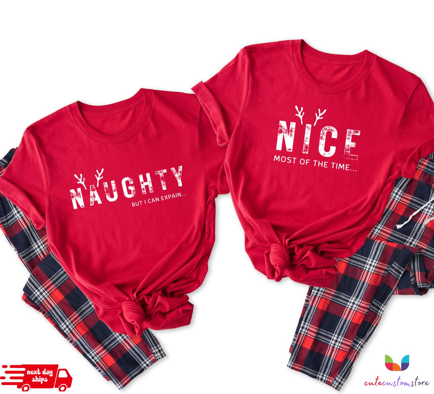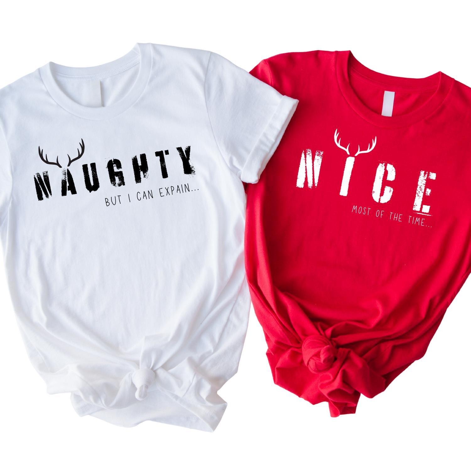 Naughty Nice Couples Christmas T-Shirts His and Hers Matching Holiday Shirts